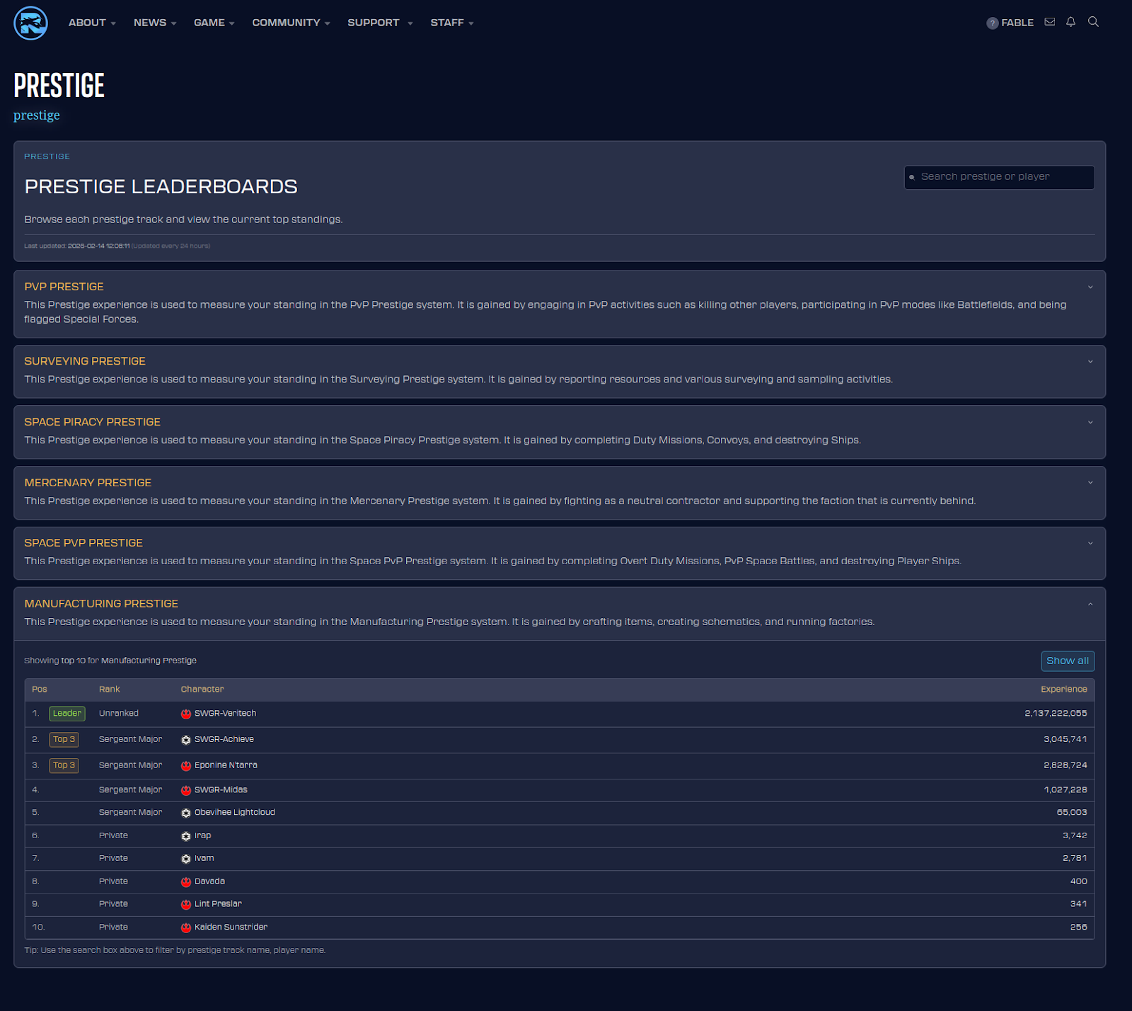 Prestige is designed to expand over time. Throughout 2026 SWGR plans to expanding the Prestige system into other areas. Prestige provides the foundation for rewarding specialization across many more aspects of the game.
