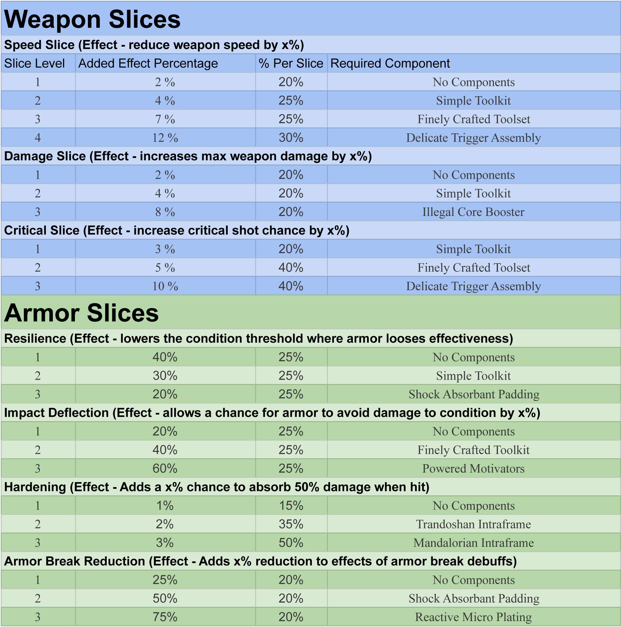 Weapon and Armor slicing quick reference card.